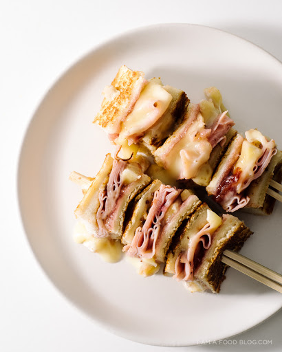 With a sharp knife, cut the brie straight from the fridge, into even slices. Spread the mustard on one slice of bread and the jam on the other. Layer the ham on the mustard-clad slice of bread and the brie on the jam slice. Sandwich the slices together. Melt about a tablespoon of butter in a medium skillet over medium-low heat. Swirl and add the sandwich and cook, flipping once, until golden brown and gooey, about 6 minutes total. Cut in to desired shapes and enjoy immediately.