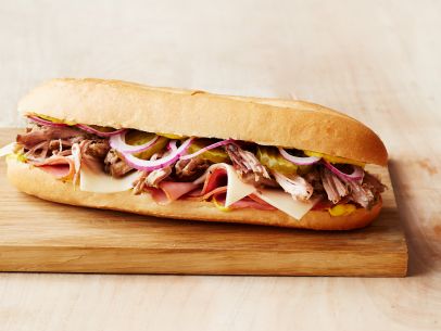 Assemble the sandwiches: Slice the roll or rolls in half lengthwise and smear both sides with mustard. Layer on the ham, cheese, pulled pork, pickles and onion and cut into portions.