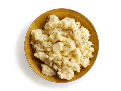 Preheat the oven to 500 degrees F. Place 6 medium russet potatoes directly on the oven rack and bake until soft, about 35 minutes. Split each potato in half and scoop out the flesh; transfer to a large bowl. Add 1 1/2 cup warmed heavy cream, 1 stick cubed salted butter, 1 1/2 teaspoons Kosher salt and a few grinds of pepper to the bowl and mash well. Top with more butter.