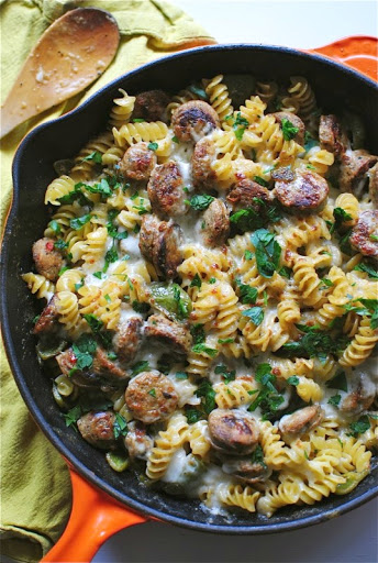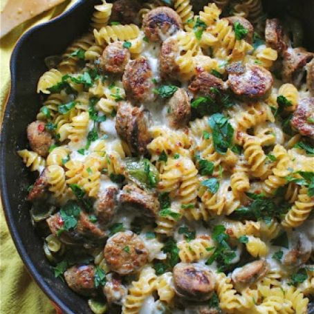 Skillet Pasta with Chicken Sausages and a Creamy Roasted Green Pepper Sauce