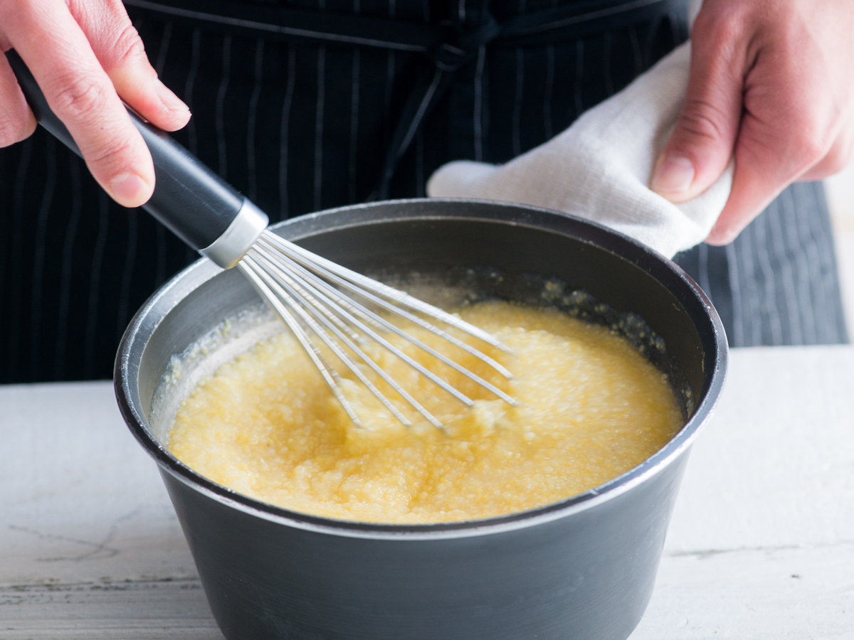In a large pot, bring the water to a boil. While whisking, gradually pour the polenta into the water. Reduce the heat to low and continue whisking for an additional minute.
