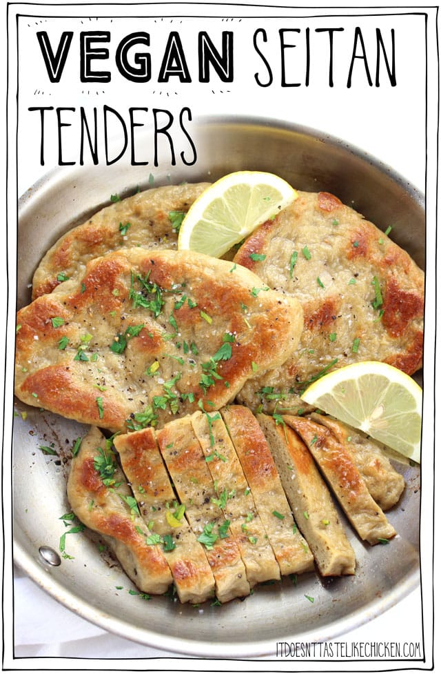 InstructionsAdd all of the ingredients to a food processor and pulse to combine until everything is well mixed and the dough forms a ball. Alternatively, if you do not have a food processor you can mix everything together in a large bowl working the dough until it forms a ball.Lightly dust a clean work surfaces with a bit of the vital wheat gluten. Turn the dough ball onto the surface and lightly dust the top with a little more vital wheat gluten. The dough will be soft and very sticky so this will help it from sticking to your hands. Do not knead the dough, kneading it will make it tough. Cut the dough ball into 6 pieces and use the tips of your fingers to press each piece of dough into an oval shape about 5" x 6".Add several inches of water to a large pot with a steamer basket and bring to a simmer. Lightly grease the steamer basket and lay the tenders in the basket. If the tenders need to overlap each other, spray the tenders with a bit of oil to stop them from sticking together. Cover and steam at a simmer for 25 minutes, flipping halfway through so they steam evenly. They will double in size. Make sure to keep it at a gentle simmer for the best texture. Once steamed, remove the tenders and let cool. Cover or put in an airtight container and chill in the fridge for a minimum of 1 hour, or for up to 3 - 4 days. You can either chill the tenders without any additional seasoning, or you could toss the tenders in your favourite marinade. The tenders shrink and firm up a bit when chilled and this results in the best texture. Once chilled, the tenders are fully cooked and edible, but you can now treat them as you would raw chicken -season and cook them as you desire. The cooking time can be short as they only need to be heated through but prepare them any way that you might prepare a chicken breast. Pan fry or grill them, bread or crust them, slice them for salad, pasta, or stirfry, cut them into nuggets, add them to burritos, tacos, or sandwiches. The options are endless!