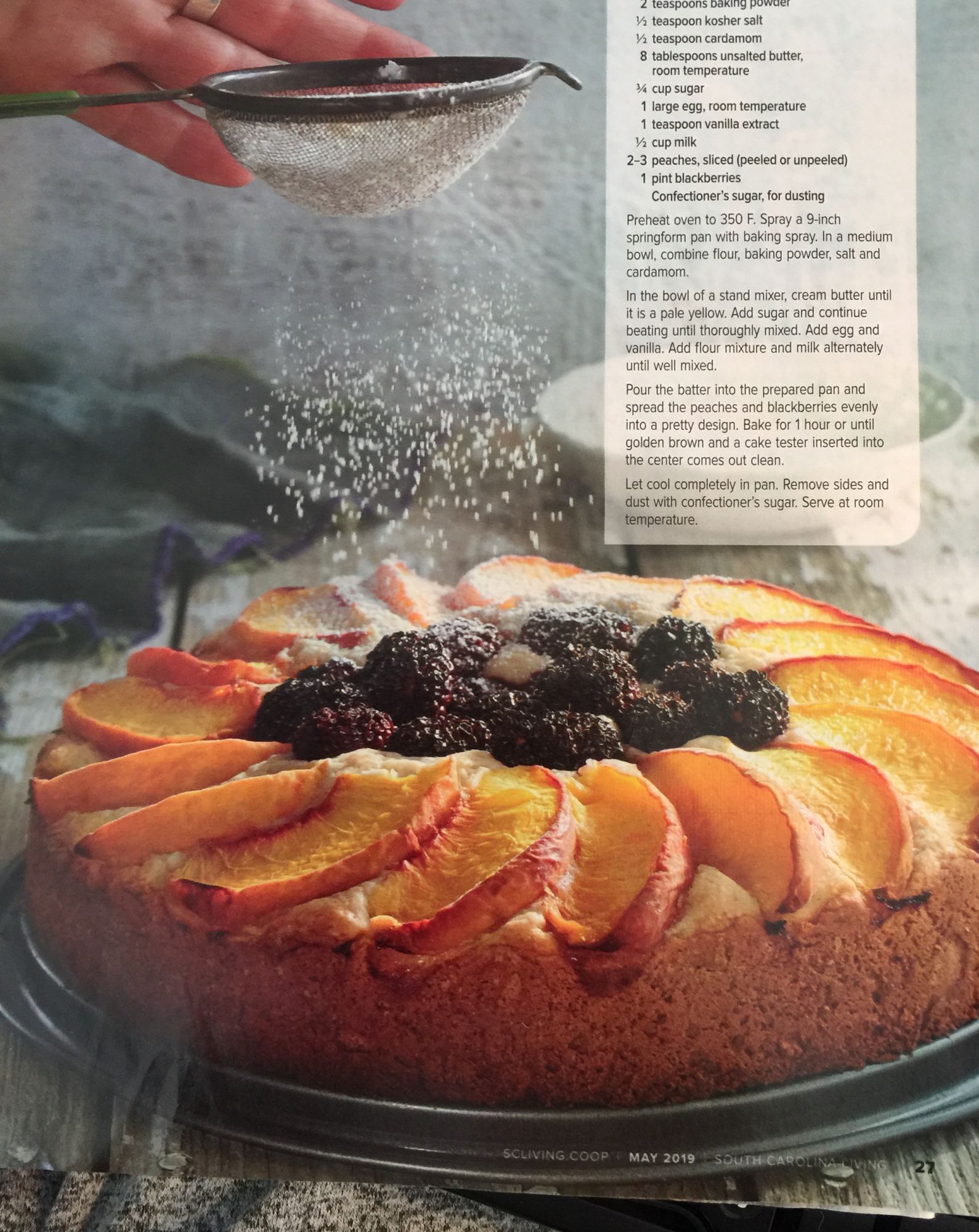 Pour the batter into the prepared pan and spread the peaches and blackberries on top in a pretty design.