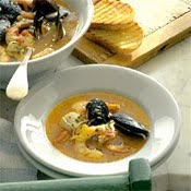 Add the wine and water and bring to a boil over high heat. Reduce the heat to medium and simmer for 15 minutes. Add the fish pieces, cover and cook for 5 minutes. Add the shrimp and mussels, re-cover and cook until the mussels open, 3-4 minutes. Discard any mussels that have not opened.