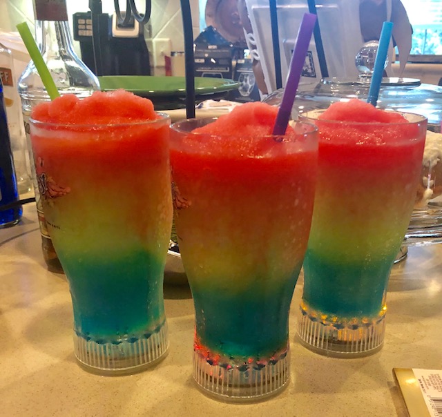 Blend the ingredients for each layer into a blender with ice, rinsing out between layers. Combine until smooth. Layer into a tall clear glass. If making more than one drink, just double, triple, etc. each layer in the blender. Makes 1.