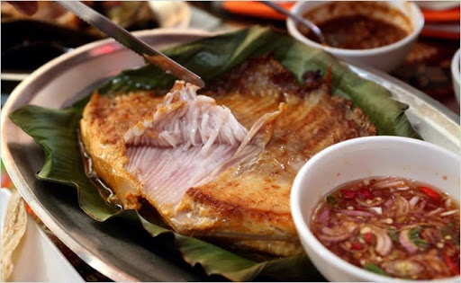 3. Cook the fish: Rinse and dry the fish and sprinkle it with salt. Heat a grill to high, or place a heavy skillet (with a lid) over medium-high heat. Spread one side of the fish with a thin layer of sambal. Place a banana leaf on grill (or in skillet), drizzle lightly with vegetable oil and place the fish on top, sambal side up. Cover grill or pan and cook about 8 minutes, until the banana leaf is toasted and the sambal is dry and fragrant. Remove the leaf and fish from the heat. Place a new banana leaf on grill or in pan, drizzle it with oil, flip fish onto it and spread more sambal on top. Cover and cook another 6 to 8 minutes, until cooked through.