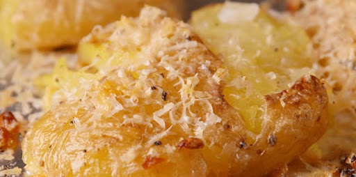 On a large rimmed baking sheet, add potatoes. Toss with melted butter, garlic and thyme. Using the end of a small glass or major jar, press down on the potatoes to smash them into a flat patty. Season each smashed potato with salt and pepper, then sprinkle Parmesan on top.