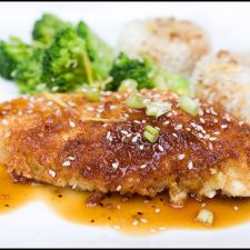 Whisk eggs and milk in a shallow dish. Add 1/2 cup almond slices to a food processor then process until mostly fine crumbs and then pour into another shallow dish. Add Panko crumbs to food processor then process until fine crumbs and then add to almond crumbs. Season almond + bread crumb mixture lightly with salt and pepper.
