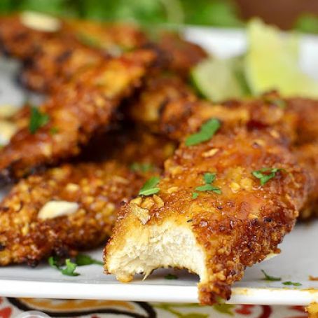 Meanwhile combine ingredients for sauce in a small saucepan then bring to a boil over medium-high heat. Lower heat to medium then cook until sauce is reduced and slightly thickened, 5-6 minutes. Pour into a wide bowl then dunk baked chicken fingers into sauce using tongs and place back onto baking sheets. Bake for 4-5 more minutes, watching closely to avoid burning, then serve sprinkled with remaining 1/4 cup sliced almonds and chopped cilantro.