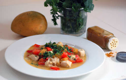 Add vinegar, water, coconut milk and mango to pan, bring to a boil briefly, then reduce heat