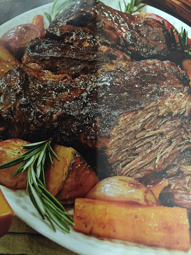 Deglaze pot with wine, scraping up any brown bits. Stir in broth, rosemary, and bay leaf, then bring to a boil over high heat. Return roast to pot, cover, and transfer to oven. Braise roast 3 hours.