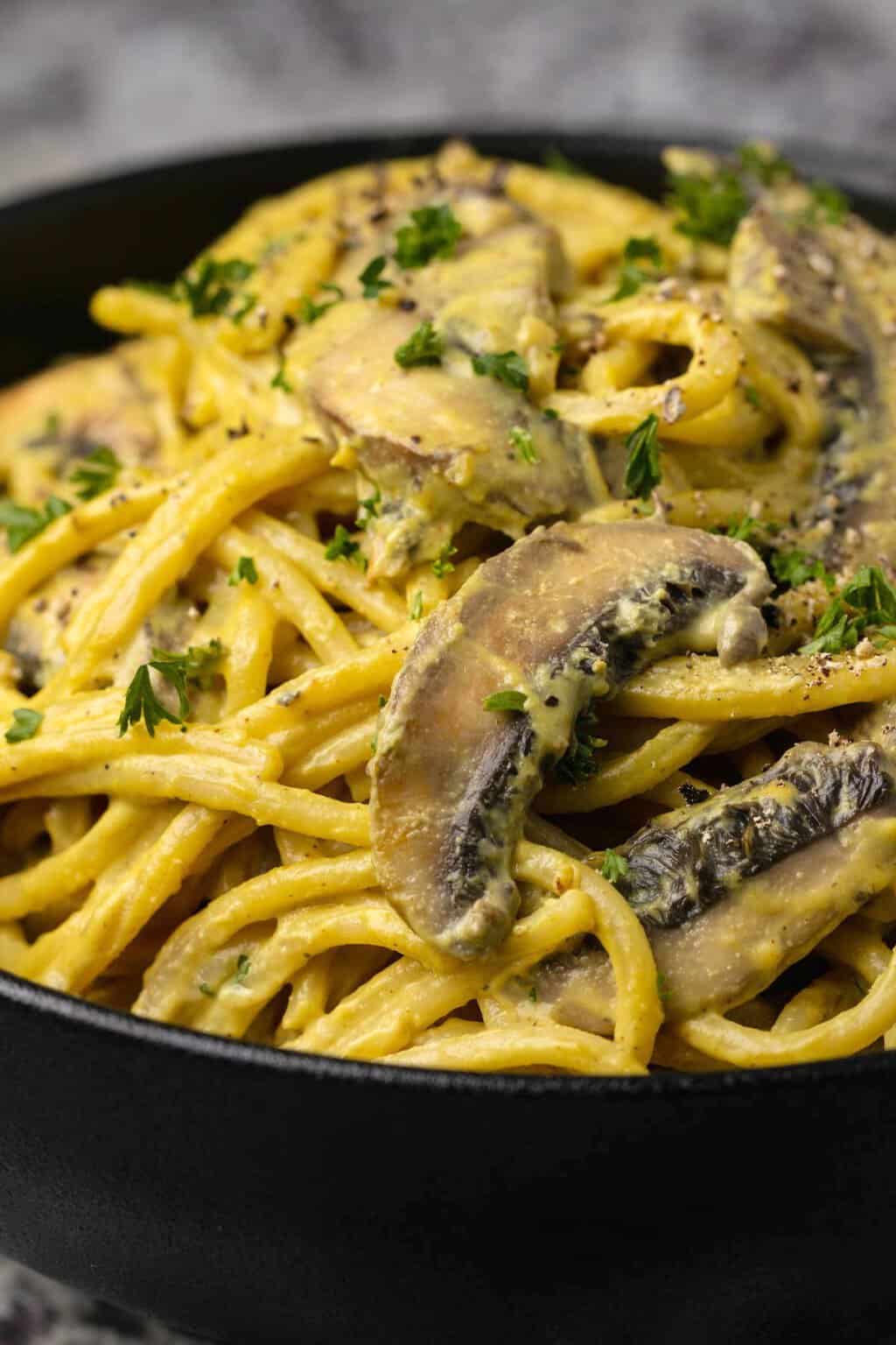 Pour the blended sauce over the top of the spaghetti and mushrooms and toss together. Add the sea salt and black pepper and toss together until everything is coated and heated together in the pan.