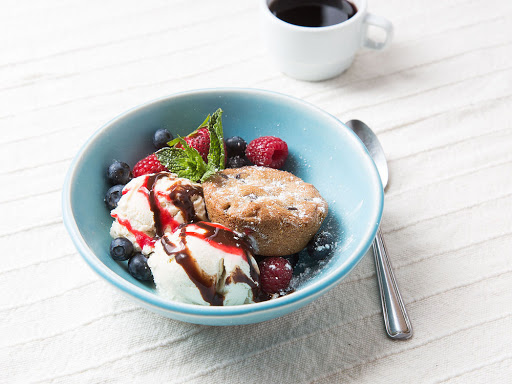 To serve, transfer each cookie to a rimmed plate or bowl. Garnish with a scoop of ice cream and some fresh berries. Drizzle with chocolate sauce and some of the raspberry coulis. Sprinkle with powdered sugar and garnish with mint leaves.