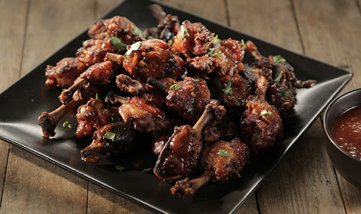 Step 5: Arrange the wings on the grill away from the heat. Add wood chunks or chips to the coals. Smoke-roast the wings until the skin is crisp and brown and the meat is cooked through to the bone (make a little slit to check), 30 to 40 minutes, or as needed. Start brushing the wings with the Smoky Beer Barbecue Sauce the last 5 minutes. Transfer the wings to a platter and brush with sauce again. Sprinkle with chopped cilantro. Serve the remaining sauce on the side.