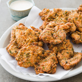 Classic American ranch dressing herbs and seasonings appear in three components of the recipe—the buttermilk coating, the flour coating, and the ranch dipping sauce—to pack summer flavors into this fried chicken. Using boneless thighs ensures juicy meat without the hour-long brining process. Frying the thin thighs takes half the time that bone-in chicken parts require, which allows the fresh herb flavors to flourish.