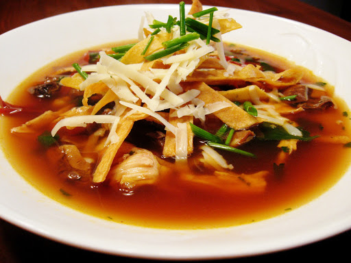 Ladle soup into bowls and top with cheese and tortilla strips, along with a drizzle of crema and a squeeze of lime.