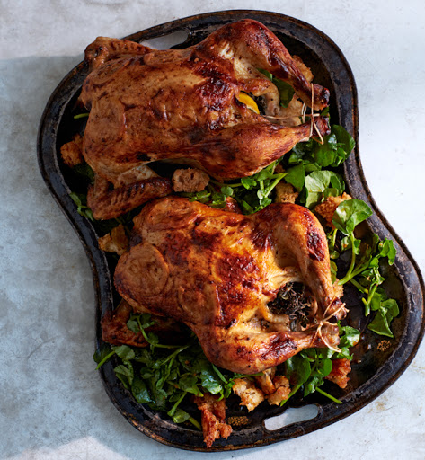 Roast chickens until they begin to brown, 30-35 minutes. Reduce oven temperature to 350° and roast until chickens are cooked through and a thermometer inserted into the thickest part of the thigh registers 165°, 20-25 minutes longer. Transfer chickens to a platter, tent with foil, and let rest while preparing bread salad. Keep oven on.