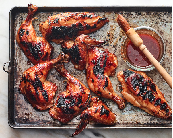 When you’re ready to cook, oil your grill grates well. Heat the grill to medium (for charcoal, the grill is ready when you can hold your hand 5 inches above the coals for 5 to 7 seconds). Add the chicken to the grill, cover, and cook 25 to 35 minutes, turning every 5 minutes to keep the chicken from burning, and basting it with the reserved marinade after you turn it, until cooked through. (Cook times will vary depending on sizes and cuts of chicken pieces, so be sure to check for doneness: Meat should not be pink and the juices should run clear.) Serve immediately.