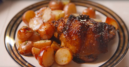 In a large skillet over medium-high heat, heat remaining tablespoon oil. Add chicken and marinade and sear, skin side down, 2 minutes, then flip and sear 2 minutes more. Add potatoes to skillet, nestling them between chicken, and rosemary sprigs.