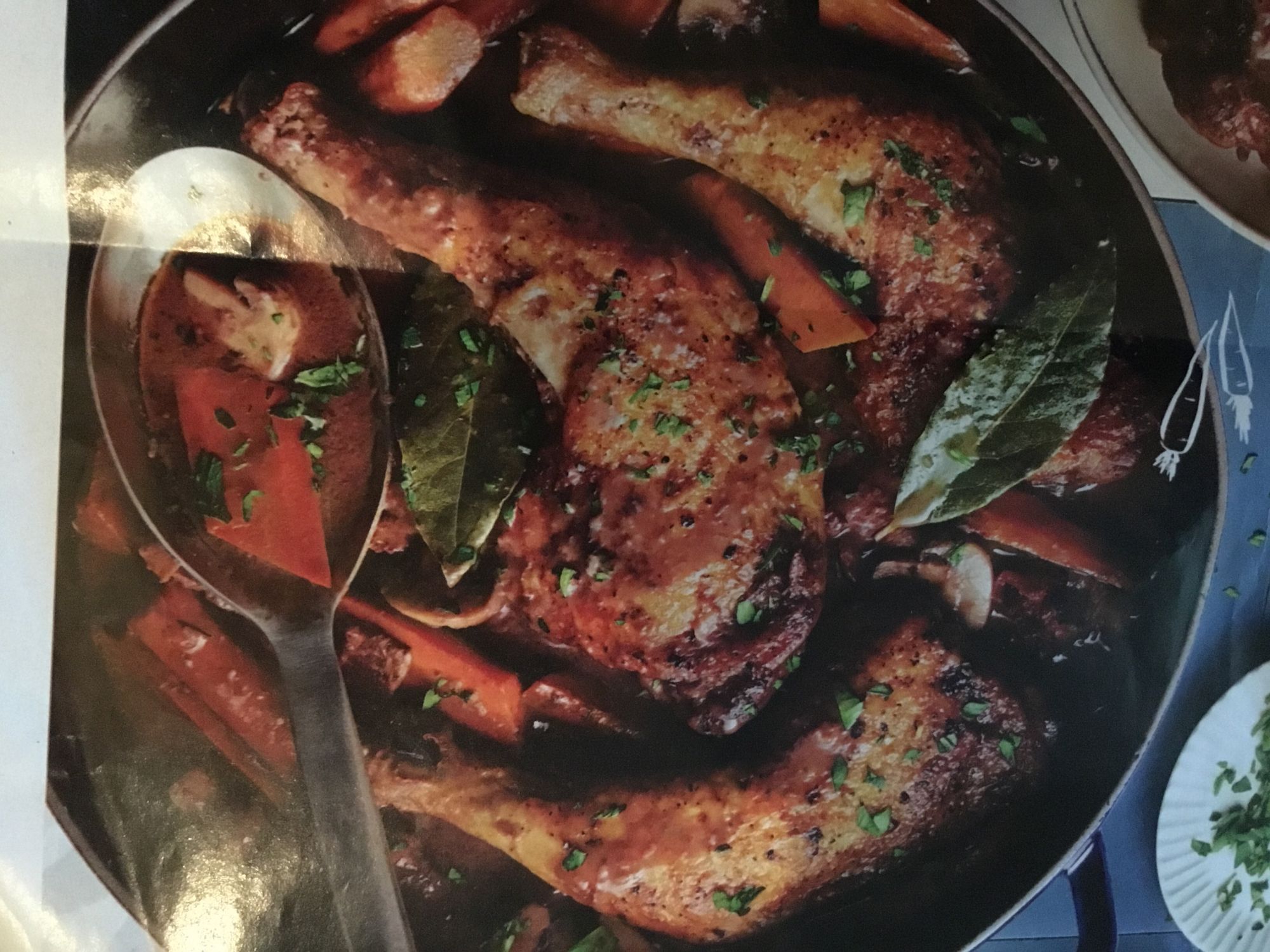Add the reserved bacon and garlic. Add the wine and enough stock to just cover the chicken. Cover and simmer over medium low heat until the chicken is cooked through, 20 to 25 minutes. Add the mushrooms and cook until tender, about five minutes. Discard the bay leaves. Divide among shallow bowls. Top with parsley.