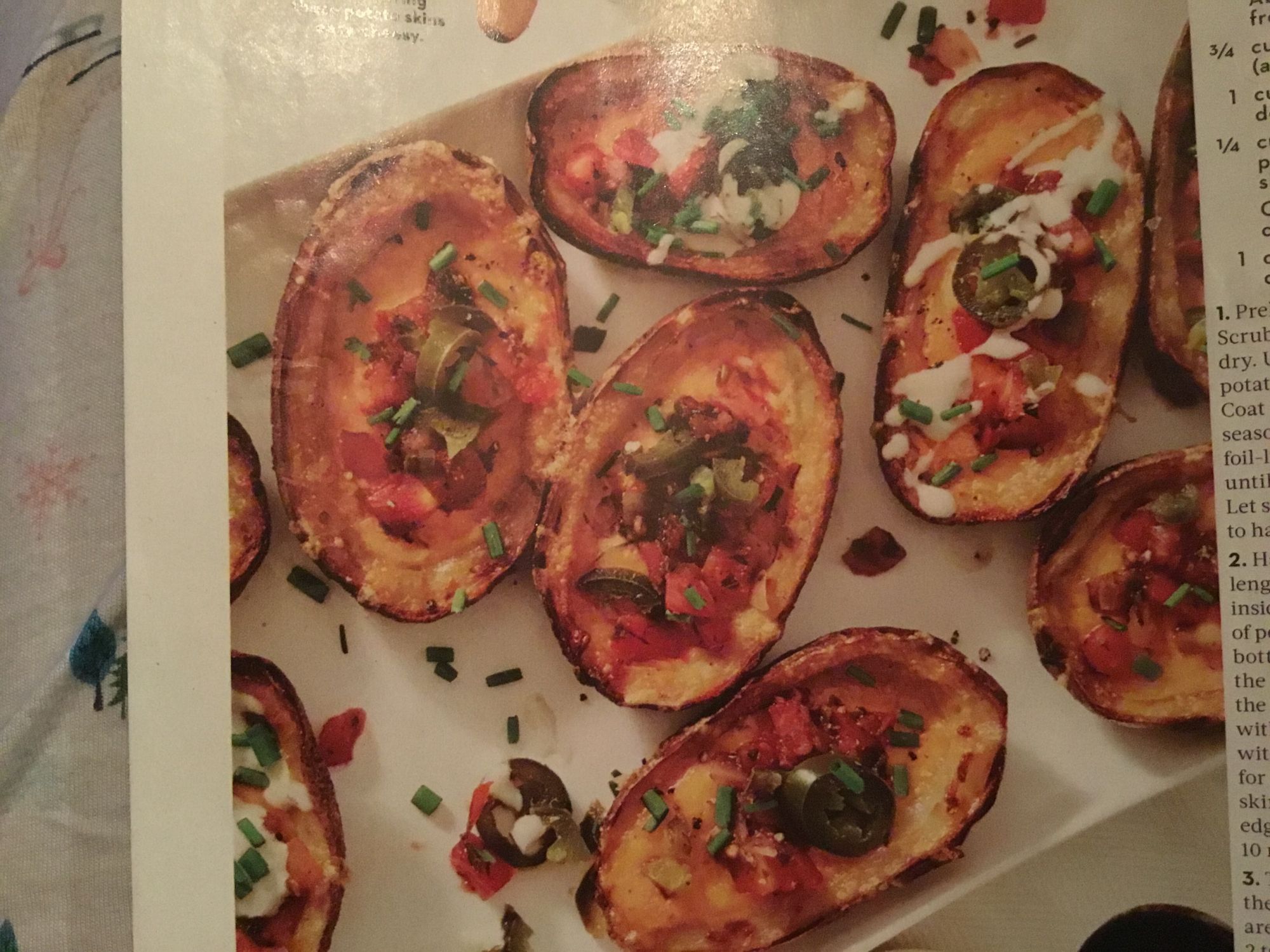 Halve the potatoes lengthwise. Scoop out the insides, leaving about 1/3 inch of potato along the sides and bottom of each skin. Return the skins, cut side up, to the baking sheet. Coat lightly with cooking spray; season with salt and pepper. Bake for 10 minutes. Turn the skins over and bake until the edges are browned about 10 minutes more.