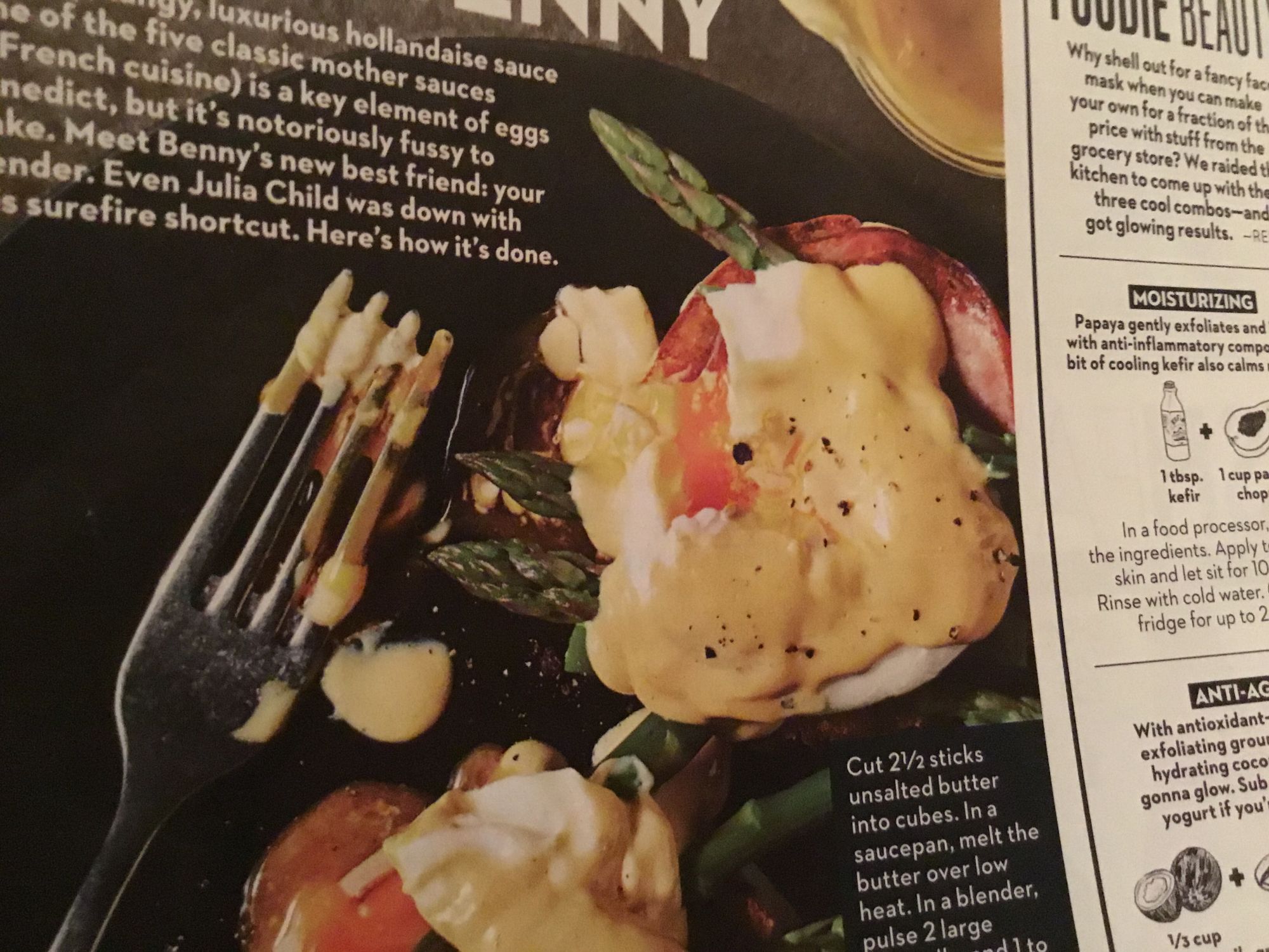 After melting the butter, in a blender pulse the egg yolks and lemon juice until smooth. With the blender running, slowly pour in the warm melted butter, leaving the white milk solids in the pan. Blend until silky, about two minutes. Season with salt, pepper, and lemon juice to taste. Spoon over poached eggs set a tab crisp slices of Canadian bacon and toast English muffins .