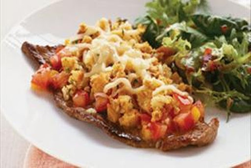 Heat oil in large skillet on medium-high heat. Add steaks; cook 1 min. on each side or until lightly browned on both sides. Top with tomato mixture, stuffing and cheese; cover.