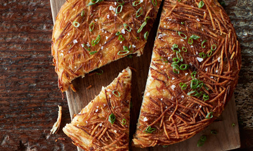 DO AHEAD: Hash browns can be made 1 hour ahead. Place on a wire rack set inside a large rimmed baking sheet and keep them in a 200° oven. Top with scallions before serving.