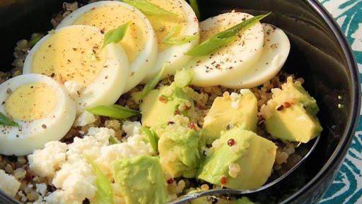 Combine quinoa and eggs in a bowl; top with avocado and feta cheese.
