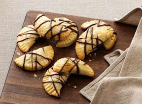 The empanadas can be baked ahead and stored (without the chocolate garnish) in the freezer. For the best results, before serving, first warm them gently in the oven at a low temperature, then drizzle with the melted chocolate.
