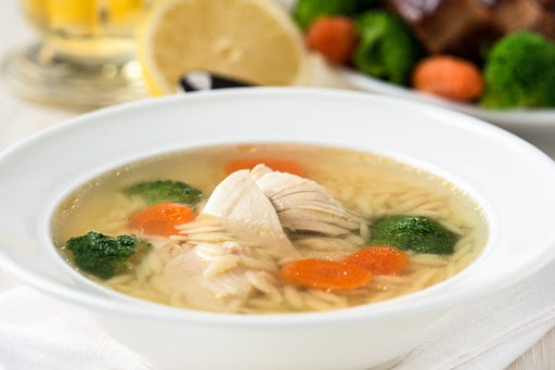 Heat Olive oil in a large pot over medium heat. Add diced chicken and allow to brown and cook through 5-7 min.  Add carrots, celery, and onion cook 5-7 minutes. Add shallot, Italian seasoning, salt and pepper. Cook another 30 seconds and add chicken broth and bay leaf. Bring to a boil and reduce to medium –low, and simmer about 10-15 minutes.