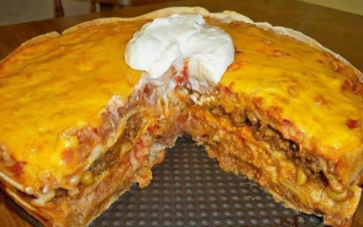 4 layer tortilla . beans ,meat, corn, rice, salsa and cheese