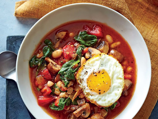 Heat 1 tablespoon oil in Dutch oven over medium-high. Add onion and garlic to pan; cook 2 minutes; stirring occasionally. Add mushrooms to pan; cook 5 to 6 minutes or until browned, stirring occasionally. Add tomatoes, stock, salt and beans to pan, and bring to a boil. Cook 5 minutes or until mixture thickens and about half of the liquid has evaporated, stirring occasionally. Add spinach; cook 2 minutes or until wilted, stirring occasionally. Remove from heat; cover and keep warm.