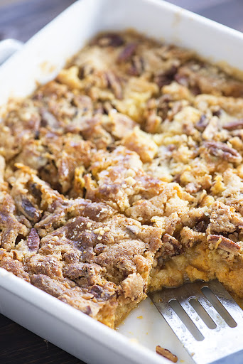 In a large bowl, beat together the pumpkin, milk, eggs, sugar, and spices until well combined. Pour into the prepared baking dish.