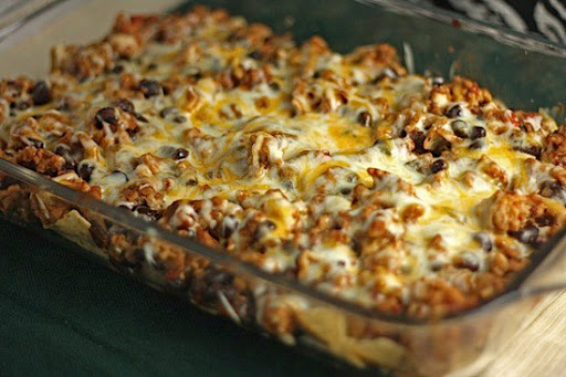 Line the bottom of a large baking dish with tortilla chips, pressing down on them lightly to break them into bite-sized pieces. Spread the meat and bean mixture over the chips and top with cheese. Add sliced jalepenos or other toppings that you want to be cooked. Bake for 20 minutes or until cheese is melted and gooey. Scoop up with additional chips if desired.