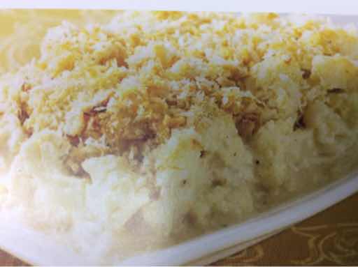Combine cauliflower and Alfredo sauce in 9" baking dish, top with bread crumbs.