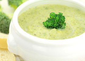 Bring chicken stock to a simmer and add chopped broccoli. Cook for a few minutes or until broccoli is tender, making sure the color does not become dull.
