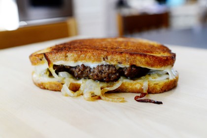 Assemble patty melts this way: Slice of bread, slice of cheese, hamburger patty, 1/4 of the cooked onions, another slice of cheese, and another slice of bread. On a clean griddle or in a skillet, melt 2 tablespoons butter and grill the sandwiches over medium heat until golden brown. Remove the sandwiches and add the remaining 2 tablespoons of butter to the skillet. Turn the sandwiches to the skillet, flipping them to the other side. Cook until golden brown and crisp, and until cheese is melted.