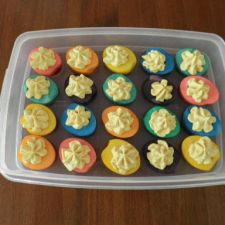 What a fun baby shower food idea! Deviled eggs are decorated with thin slices of vienna sausage and chocolate sprinkles for eyes. (Don't worry, the sprinkles don't add the first bit of flavor to the eggs!)