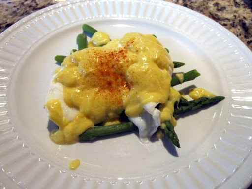 Place the asparagus spears on a plate, top with the poached eggs, cover and set aside.