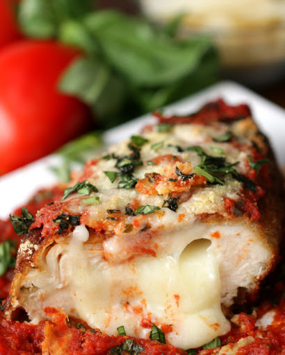 9. Place ⅔ of the tomato sauce evenly on the bottom of a baking dish. Place the chicken on top.