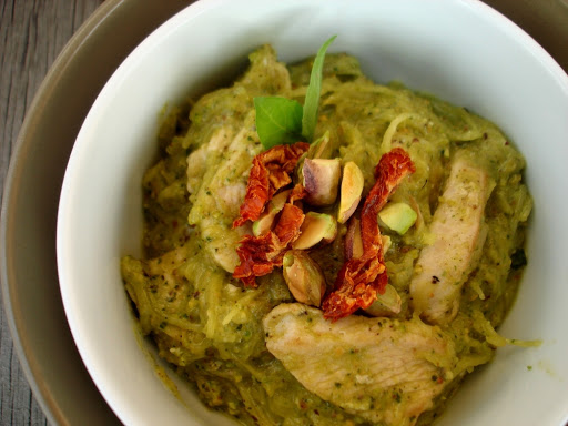 When your spaghetti squash is done cooking and has cooled a bit, use a fork to pull the threads out of the spaghetti squash and place directly into your pesto and chicken pan.