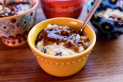 Top each portion of rice pudding with some of the Caramel-Pecan Sauce.