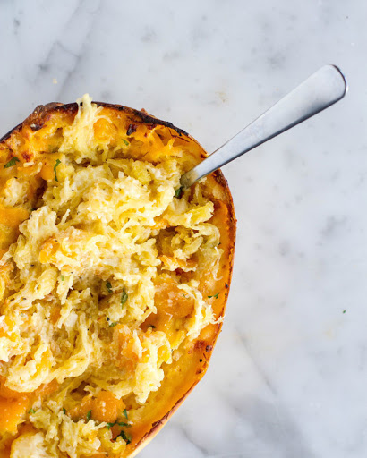 4. Use a fork to scrape the squash strands and “fluff” it up.