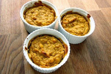 Preheat oven to 350 F. Bring Neufactel cheese to room temperature either by leaving it out of the fridge or unwrapping and putting in the microwave for 30 seconds. Using a mixer, blend Neufchatel cheese in a bowl to fluff. Add pumpkin, sugar, and spice and taste. Add more sugar until you get your desired sweetness. Mix in eggs and spoon into ramekins or loaf pan. Bake for 40 minutes or until center of pie is firm.