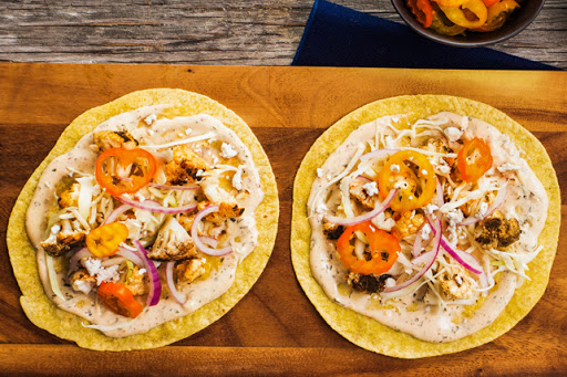 Spread remaining dressing onto tortillas; top with cauliflower and remaining ingredients.