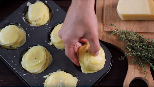 Now layer the potatoes into stacks and place them into the muffin cups. Sprinkle with more salt and pepper to taste.