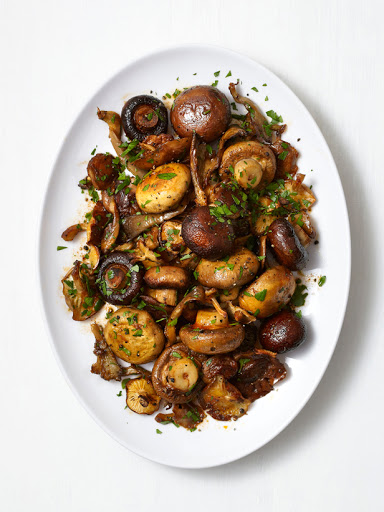 Toss 2 pounds whole mixed mushrooms, 1 1/2 tablespoons olive oil, and salt and pepper to taste in a bowl. Spread on a baking sheet and roast at 425 degrees F, stirring a few times, until tender and browned, 30 to 35 minutes. Cook 3 thinly sliced garlic cloves and 1/2 teaspoon smoked paprika in butter until soft; toss with the mushrooms. Sprinkle with chopped parsley and salt.