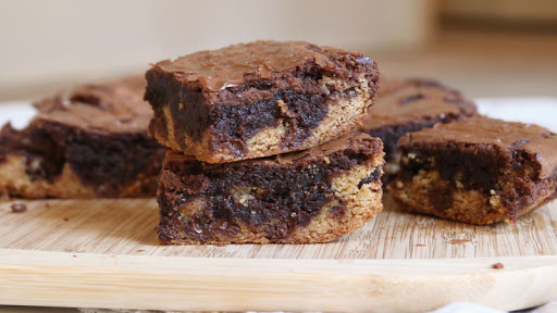 In medium bowl, stir Brownie Layer ingredients until well blended. Spread on top of cookie layer in pan.