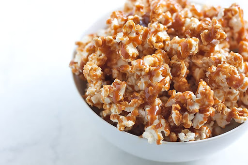 Immediately, pour the caramel in batches onto the popcorn, stirring the popcorn after pouring the caramel in each time. Let cool slightly and serve.